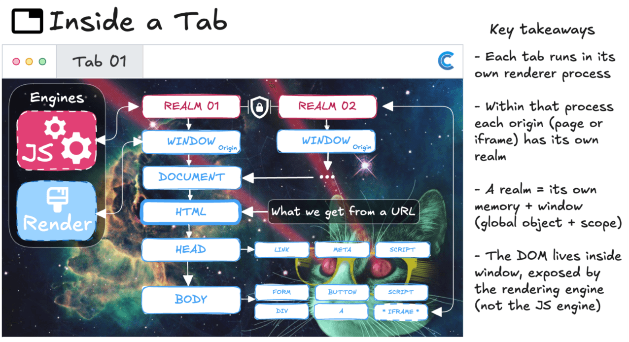 Inside every tab, beneath the HTML, scripts, and visuals, the browser quietly creates something called a realm. You won’t see it in DevTools, but it’s one of the most important concepts in how browsers stay safe and sane. A realm is like a private room where a website’s code runs. It gets its own memory, its own global environment (window), and its own copies of JavaScript’s built-in features like Array, Object, and Promise. Nothing inside that room is shared by default.