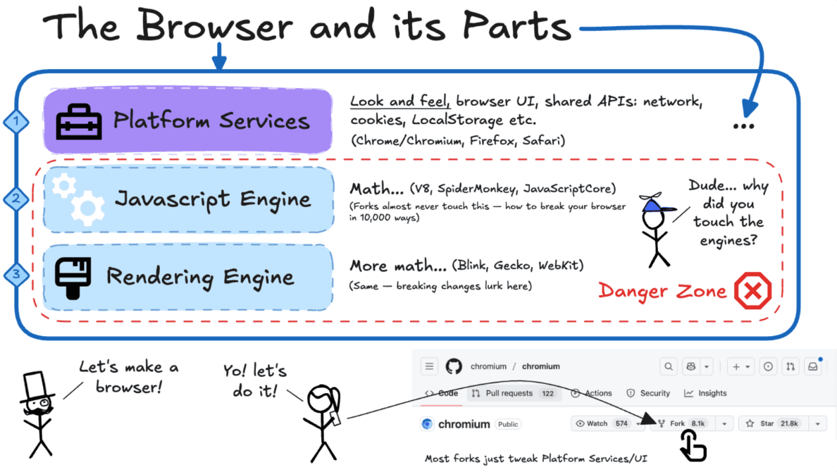 Together, the JavaScript engine and rendering engine form the Danger Zone, not because it’s unsafe for users, but because it’s dangerous for browser vendors to modify. One misplaced tweak and an entire ecosystem of websites could fail to load or display correctly. So instead, most browsers, especially forks of Chromium, stay safely above this line, choosing to change only the platform layer.