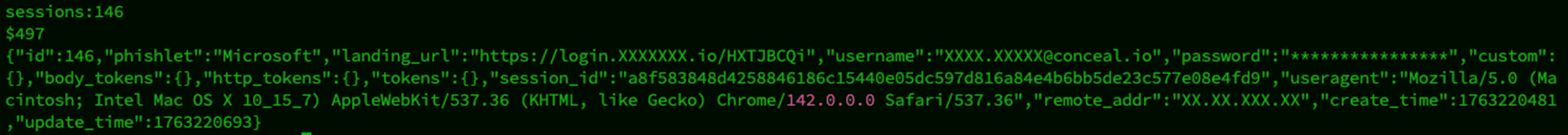 Once the victim has passed the MFA challenge, the login is successful and complete. If the credential provider has provided any session cookies, the AiTM proxy also has this data. Here’s an actual example of the data captured by the AiTM proxy.