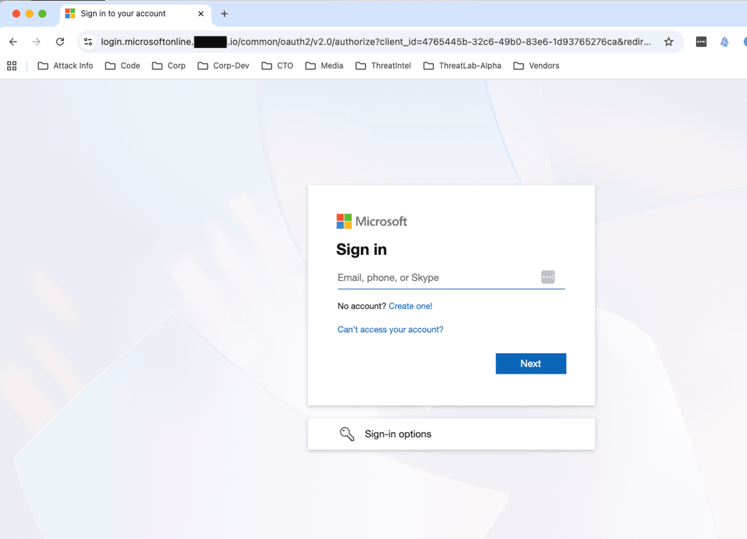 Once the unsuspecting victim clicks on the link, they are taken to a login page. Two things to note in particular on this page. First, the content is a legitimate Microsoft login page. Second, the URL is not pointing to Microsoft but upon a quick look, it appears to be correct. This is a major reason why AiTM attacks can be so successful, in this case, the user sees the login page is what they have seen hundreds of times and a glance at the URL shows the words “login” and “microsoftonline”, so they feel free to proceed to handle the critical task.