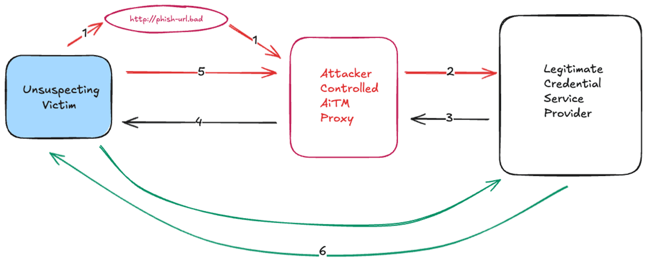 The following illustrates what is happening in a AiTM phishing attack
