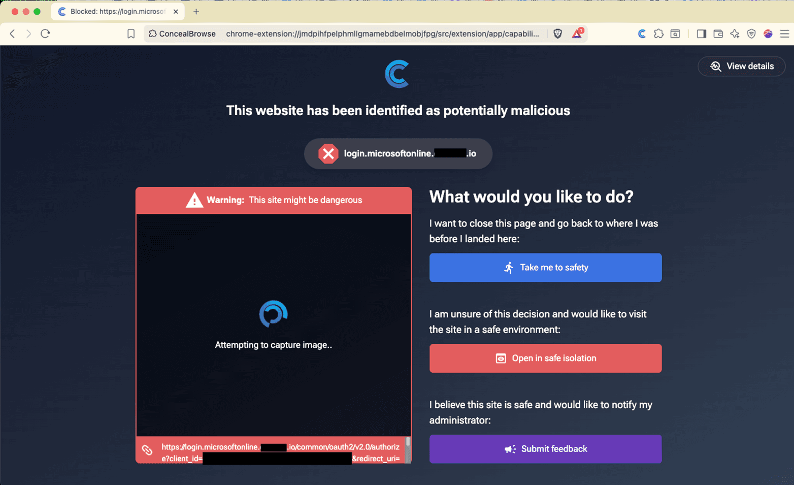If an AiTM attack were to occur in the wild to one of our customers, they would be blocked. Our custom block page gives the user the ability to leave the infected page or open the page in safe isolation. The latter allows you to go into an isolated session where you can see the page that would be displayed but you are not be permitted to enter any text via keyboard or copy/paste. In addition, when in isolation, no malicious scripts run in context of the user’s browser. The user is also given the option to submit feedback to the administrators to provide any information they deem appropriate. An incident report would be sent to the administrators so they will have record of the event and can start an incident response effort to investigate the initial phishing attack.
