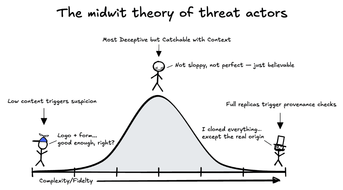 That’s why we think of deception on a curve, not a line. At one end are the bare-bones pages: just a logo, a form, and a hope that someone won’t notice the missing pieces or bad grammar. At the other end are sophisticated clones, sometimes copied pixel-for-pixel from real sites. You might assume the clones are harder to detect, but they’re not. Once you start checking the origin, hosting provider, certificate chains, and resource provenance, perfection cracks.