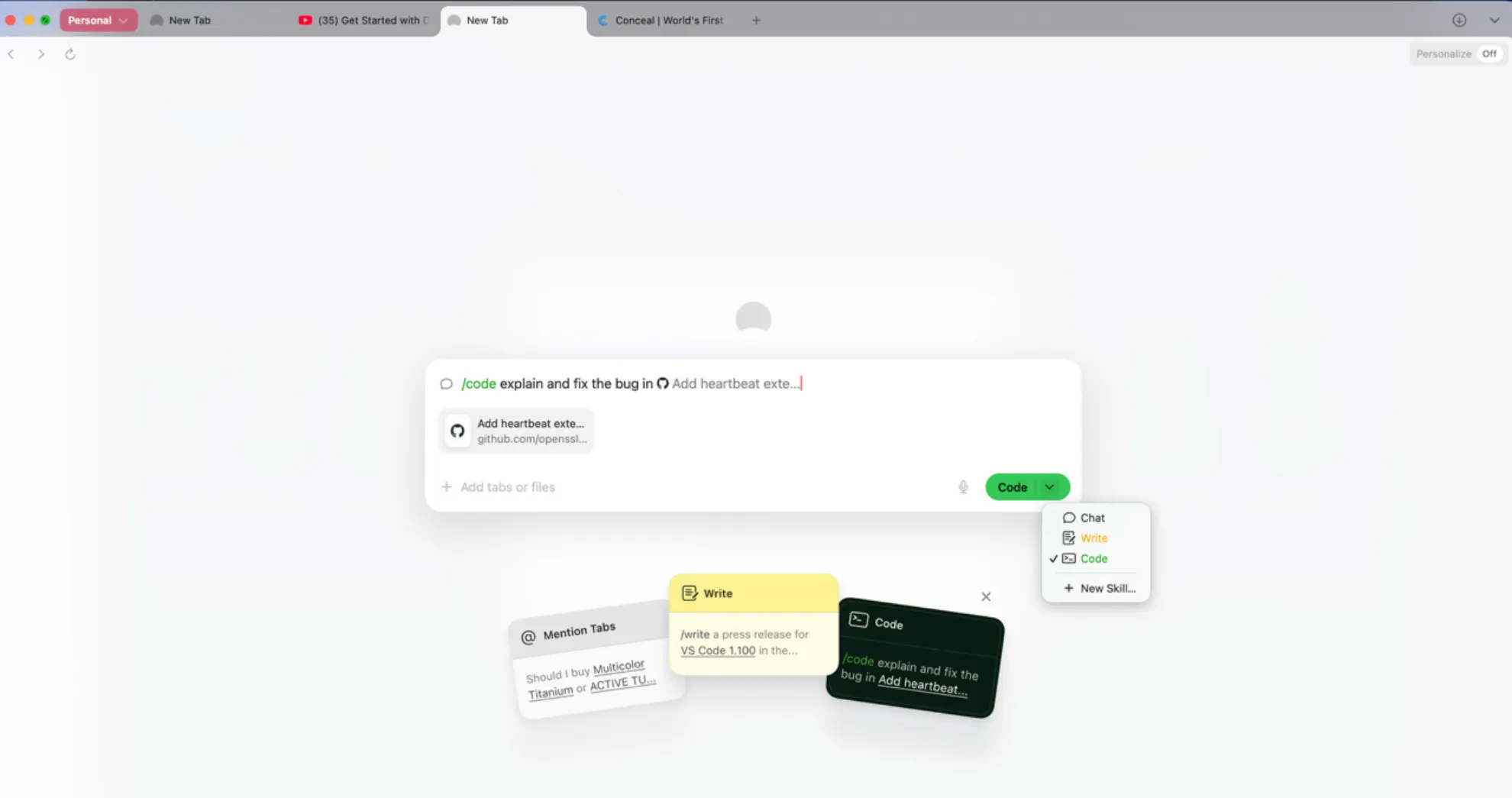 When you first open Dia, it’s ready to help whether you’re writing articles, coding, troubleshooting, or opening the built-in chat experience. Everything is natively integrated, not bolted on. You’re immediately presented with a central workspace to begin your search or tasks, with no added extensions, just a pure AI experience. Because it’s built on Chromium, users can still add extensions and enterprise-grade security solutions like Conceal’s Browser Native SSE platform. The result is a fully integrated, sleek AI experience combined with the security you need to stay protected from modern threats.